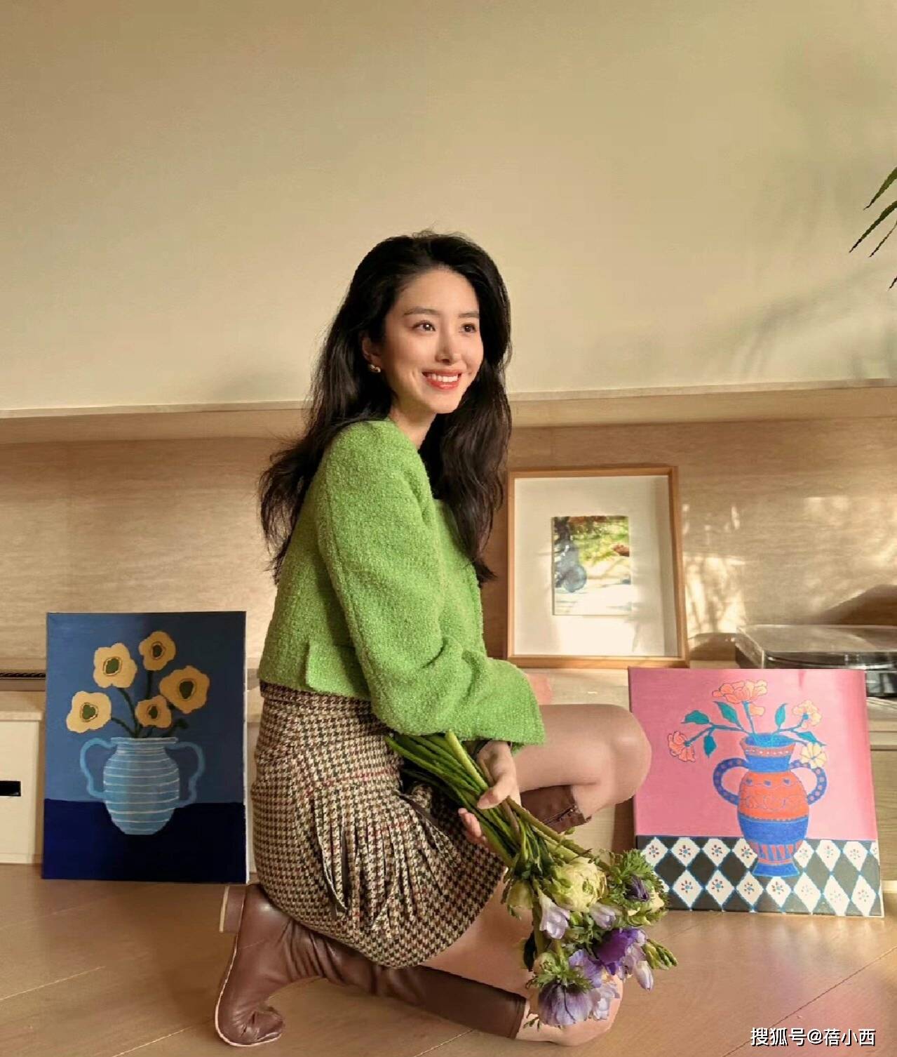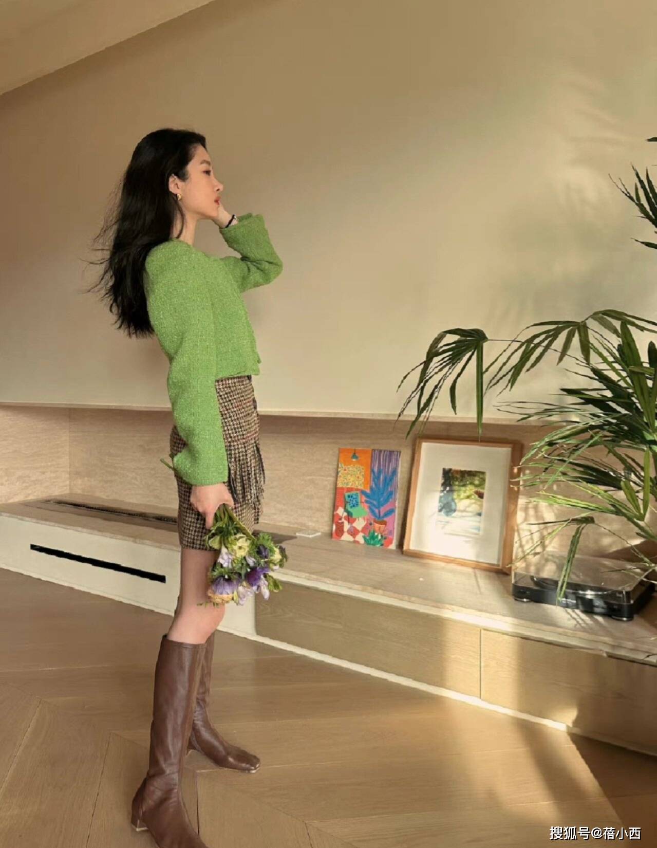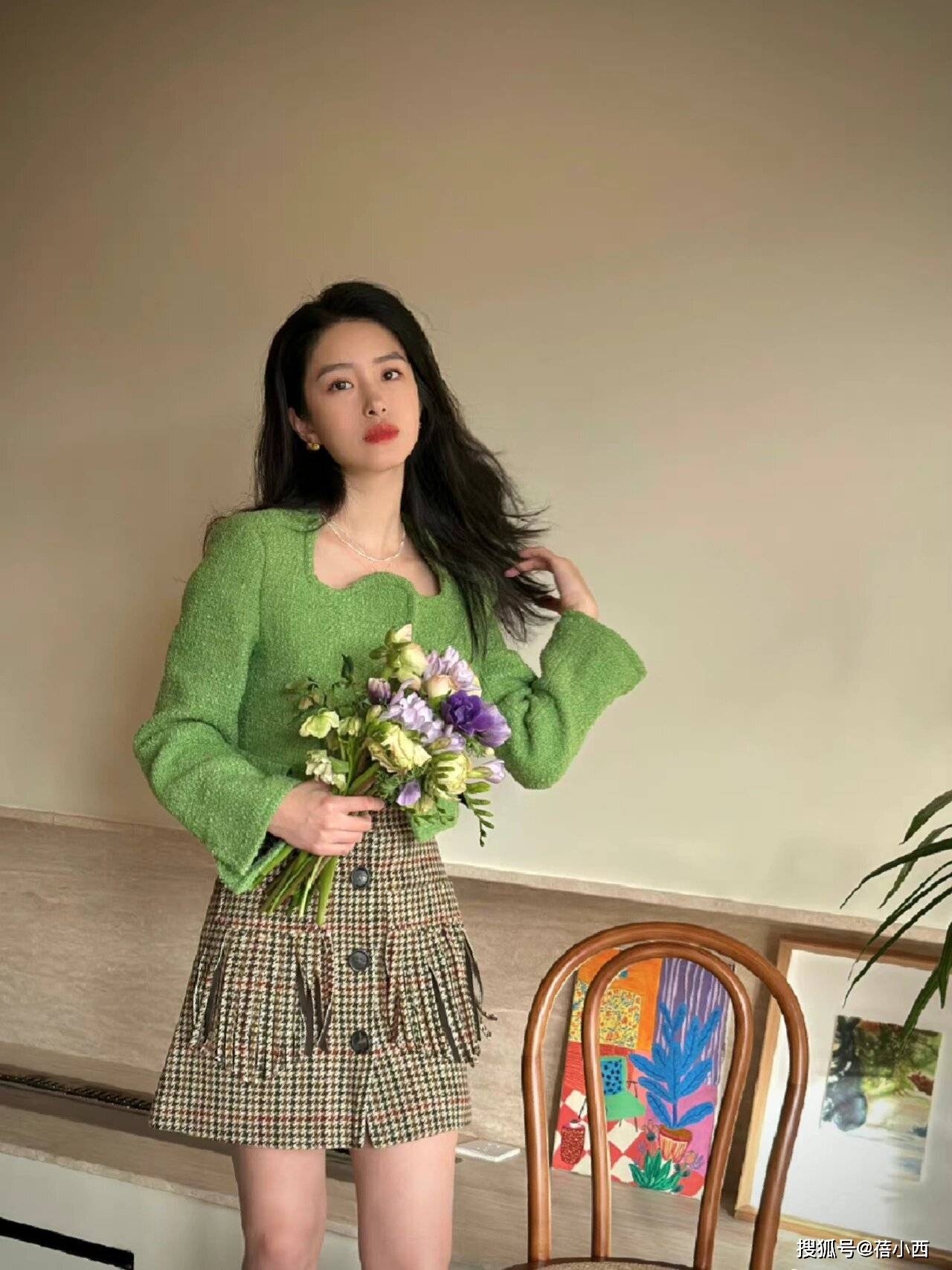 短款外套与高腰半身裙的组合,在视觉上调整身材比例,塑造更高挑的轮廓,对身材偏矮、腿型不直的人尤其友好。