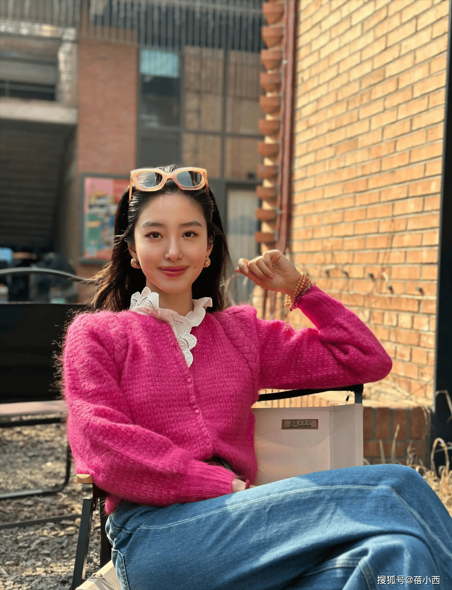 冬季的搭配中,玫红色针织衫充满女人味,针织单品在寒冷季节的出镜率很高。选择玫红这种明亮色调,可以打破沉闷,提升肤色的明亮度,让整体造型更出彩。蓝色牛仔裤与玫红针织衫的组合沿袭了经典配色的时髦感,比起黑白对比更显年轻。