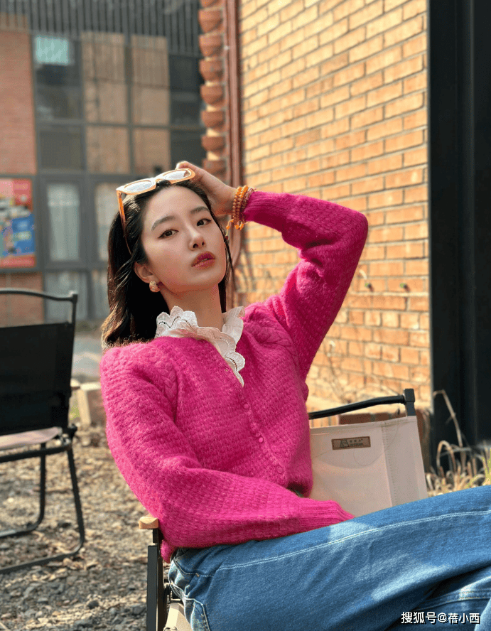 杨采钰身材纤细、肤色白皙,穿上这件略显挑战性的玫红针织衫后,整个人更显红润有气色。如果在里面搭配白衬衫,层次就会更加突出,领口若露出和木耳边的细节也增添了可爱俏皮的减龄效果。