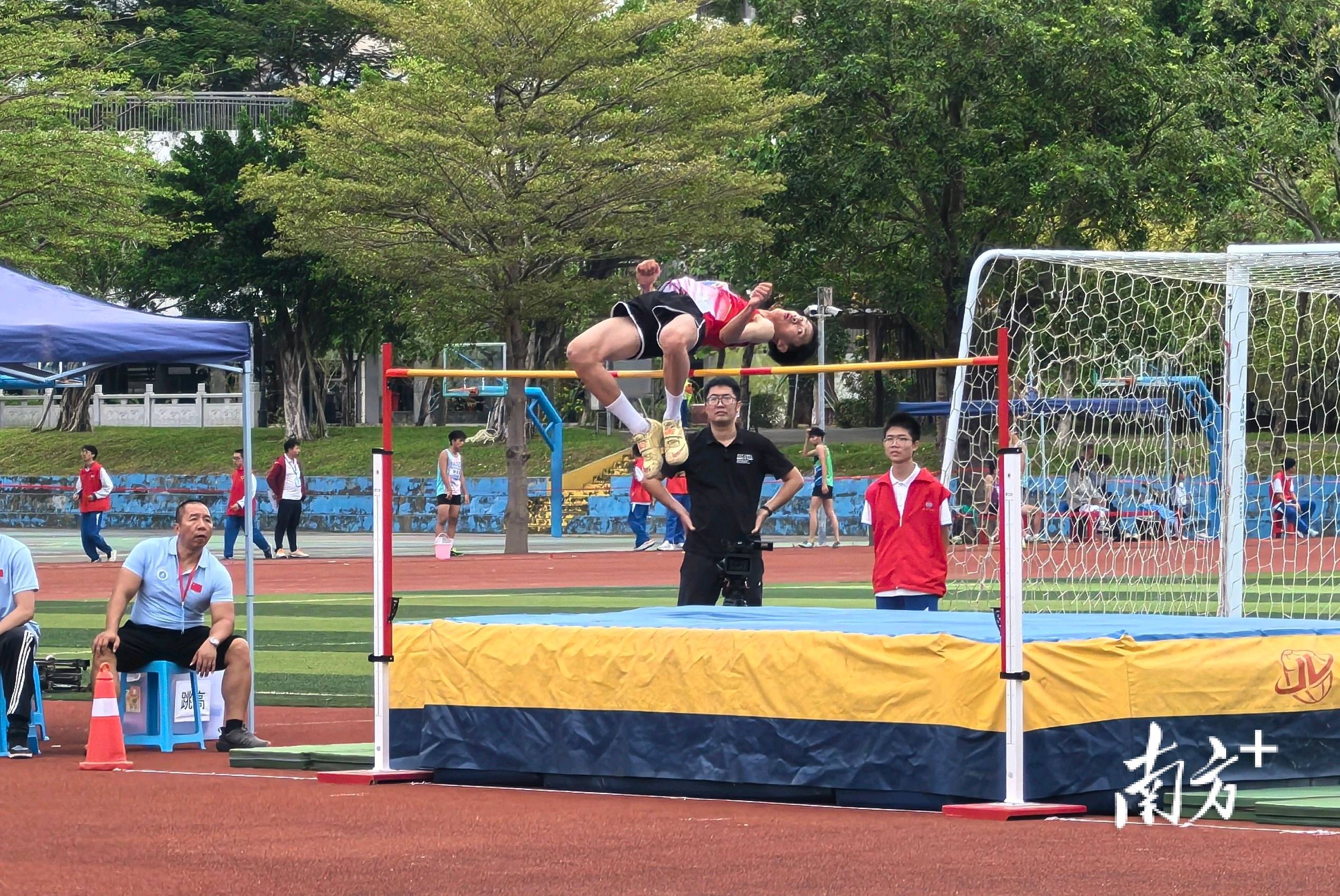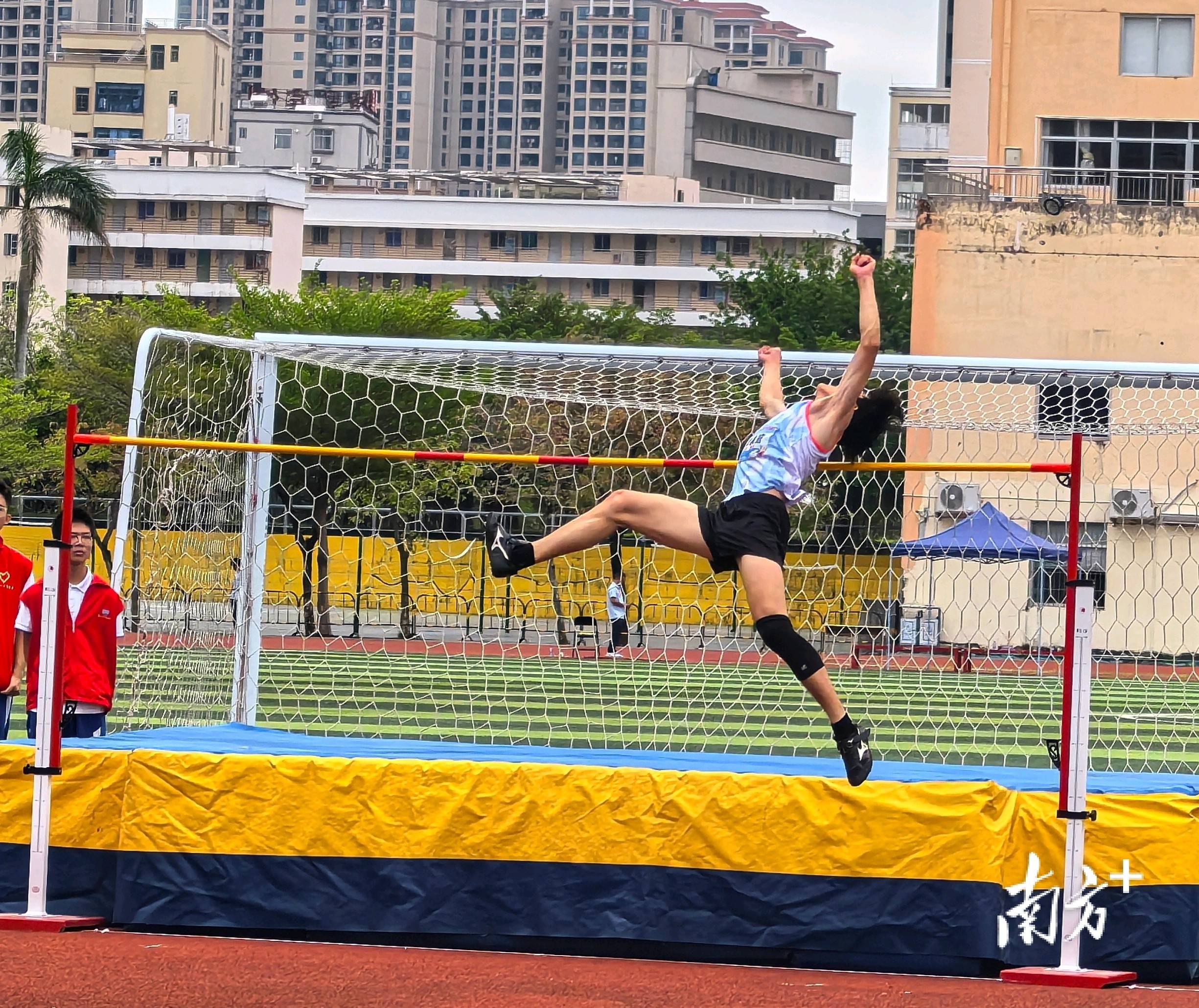 与此同时,跳高区传来阵阵惊呼。一名身材修长的选手正挑战1.75米高度。助跑、踏跳、腾空、背越式过杆、落垫一气呵成,整个动作流畅优美。成功过杆后,他在海绵垫上握拳轻呼,队友们在场边欢呼雀跃。