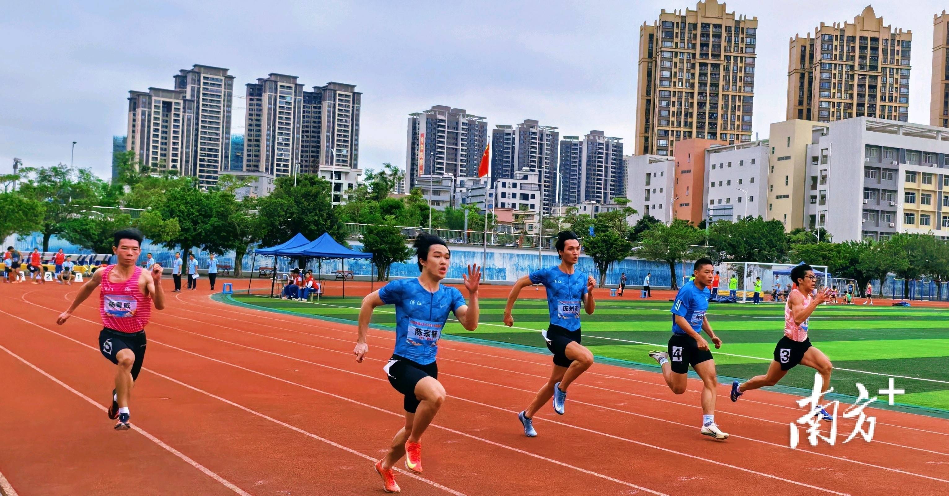 晨光初露,湛江市第二中学运动场上,发令枪响划破天际,少年健儿如离弦之箭奔向终点,看台上响起阵阵助威声。